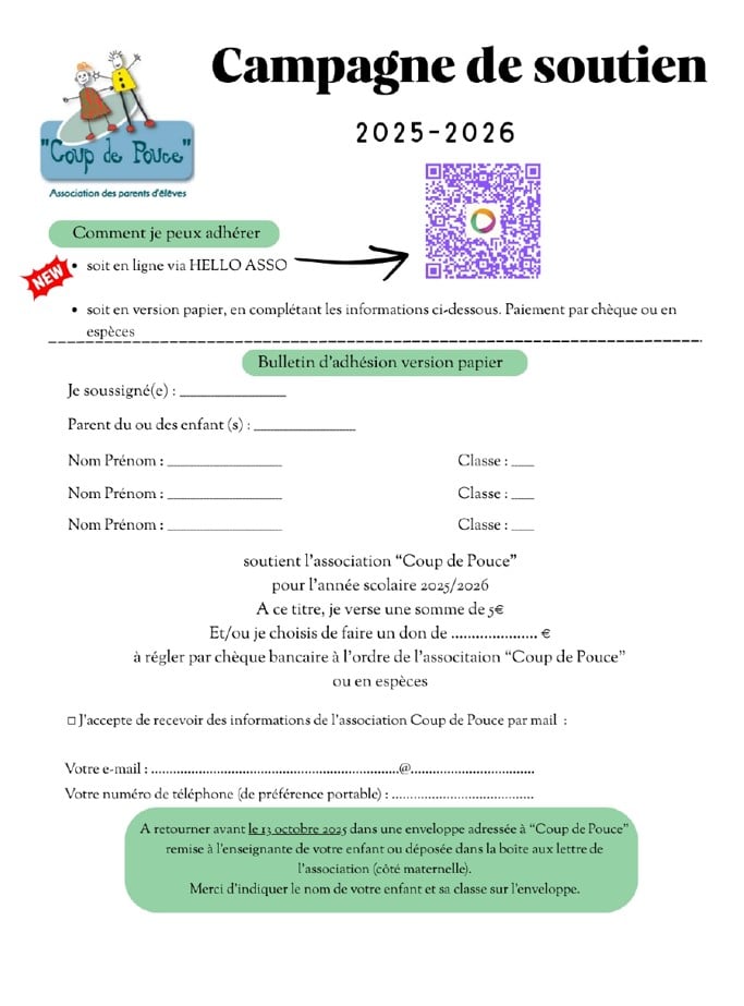 L’association coup de pouce (association des parents d’élèves) lance sa campagne d’adhésion pour 2025-2026.
