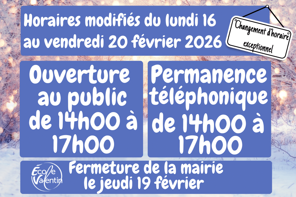 Du lundi 16 au vendredi 20 février, la mairie d’Ecole-Valentin sera ouverte au public de 14h à 17h