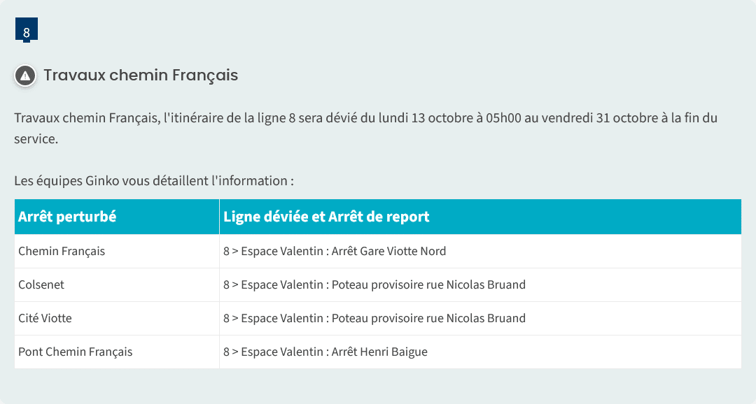 ⚠Suite à des travaux chemin Français, l’itinéraire de la ligne de bus n° 8 🚍Centre-ville – Battant <> Espace Valentin
