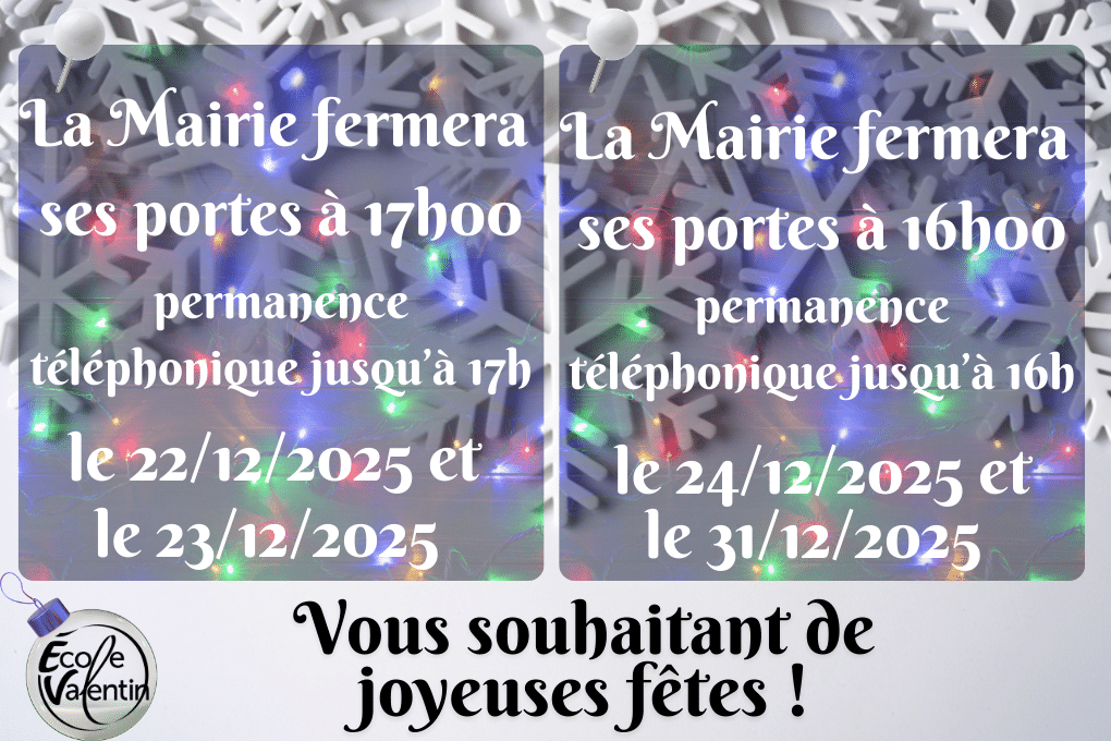 🎄Avec l’arrivée des fêtes de fin d’années📆, les horaires de votre mairie sont exceptionnellement modifier, on vous explique tout 👇