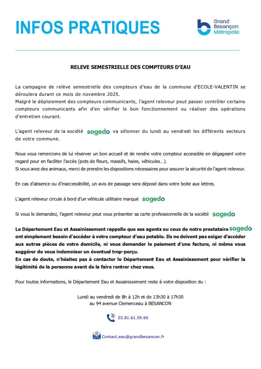 La campagne de relève semestrielle des compteurs d’eau de la commune débutera vers le lundi 3 novembre 2025 pour une durée estimative d’un mois.