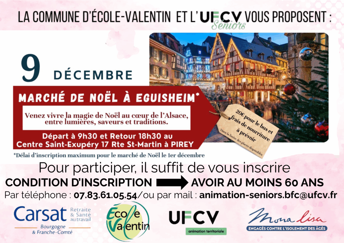 - 9 décembre 2025 : Marché de Noël à EGUISHEIM (prévoir 20€ pour le bus et les frais de nourriture sur place)