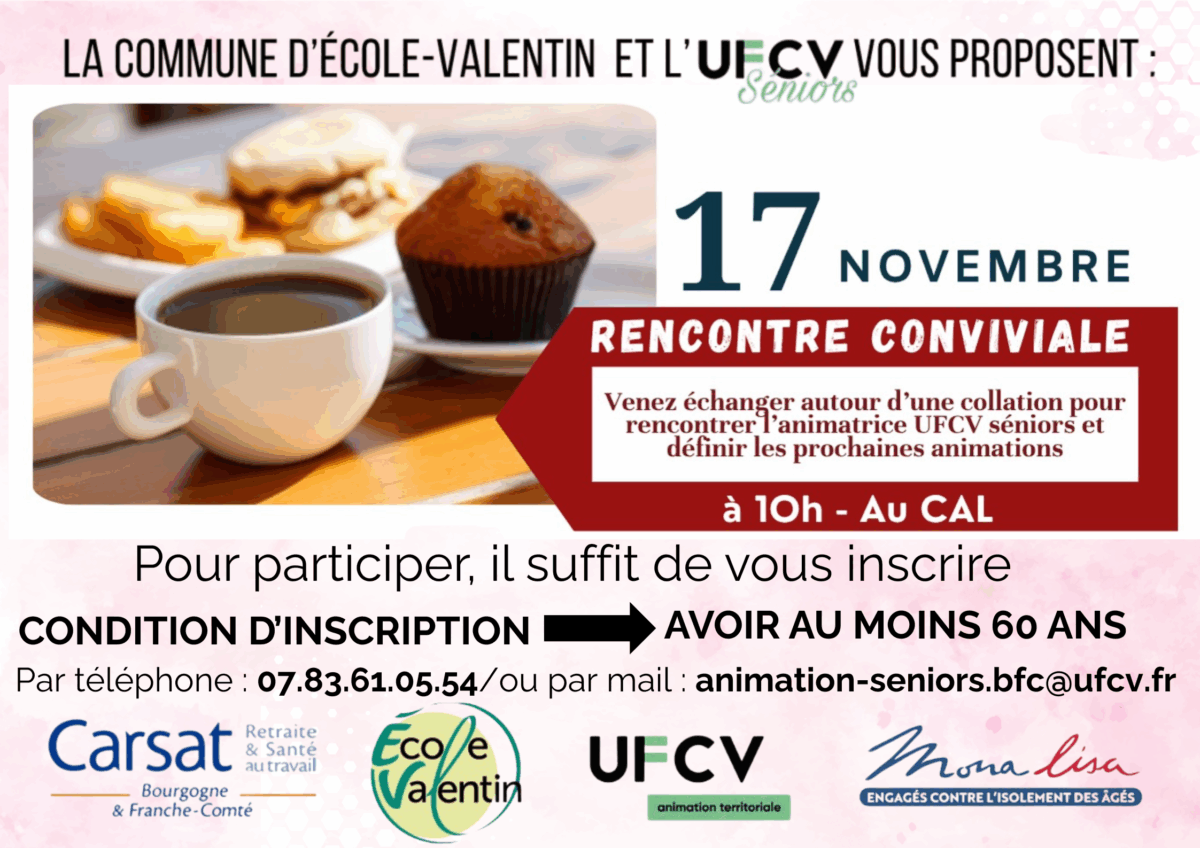 - 17 novembre 2025 : Rencontre conviviale : Venez échanger autour d’une collation pour rencontre la nouvelle animatrice UFCV séniors et définir les prochaines animations