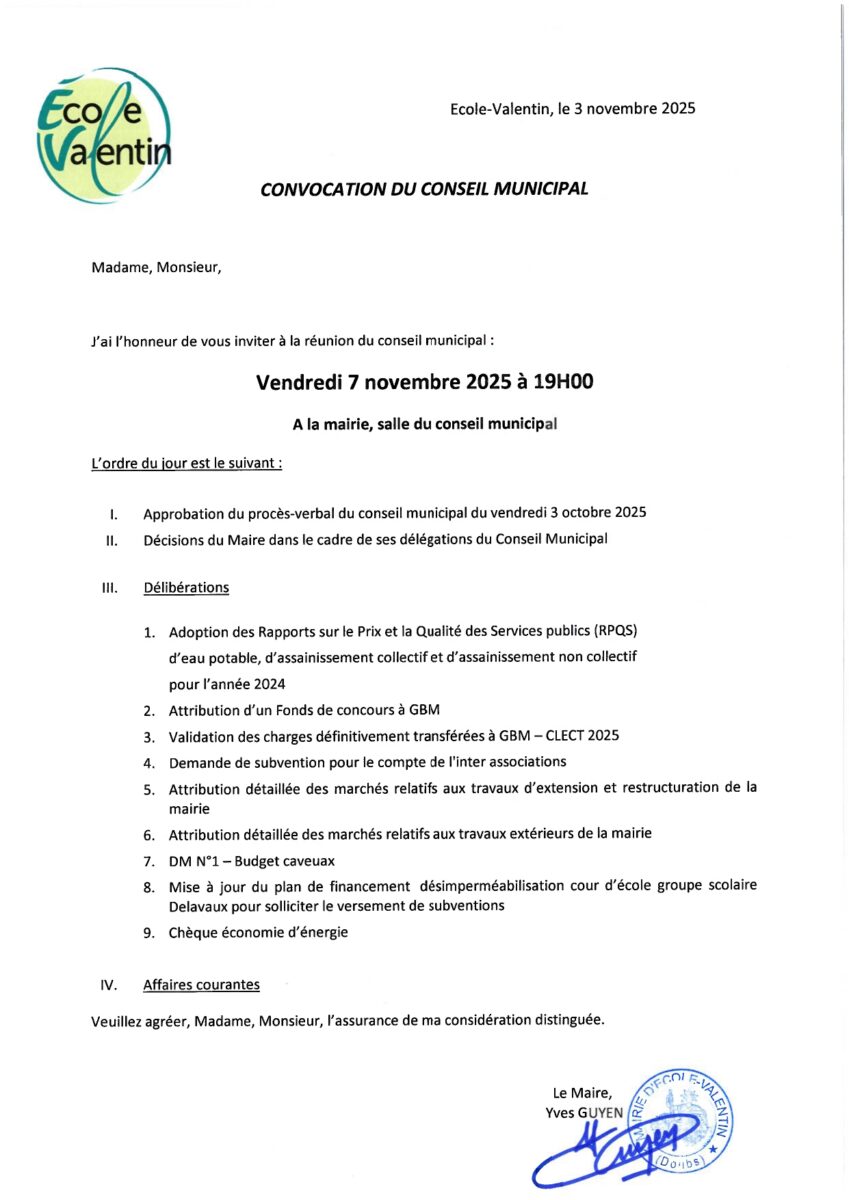 Conseil municipal vendredi 07 novembre 2025 à 19h00 en Mairie salle du Conseil municipal