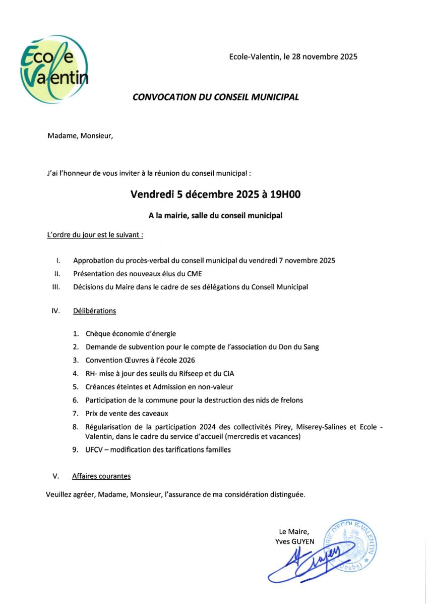 Conseil municipal vendredi 05 décembre 2025 à 19h00 en Mairie salle du Conseil municipal