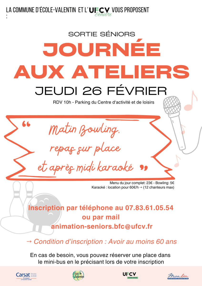 L’UFCV séniors propose à nos séniors une sortie aux ateliers sur toute une journée : « matin bowling, repas sur place et après-midi karaoké » le jeudi 26 février 2026.